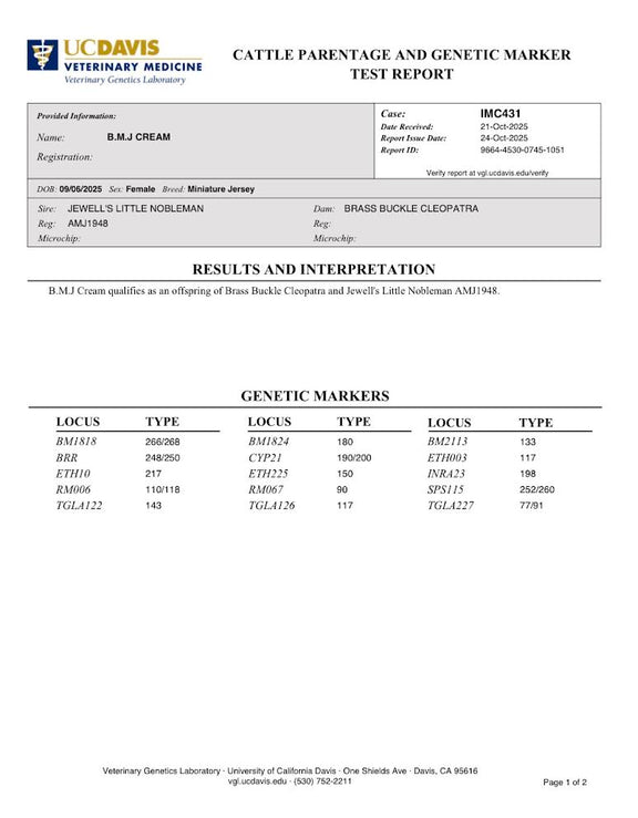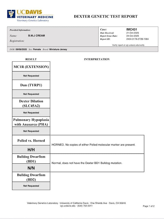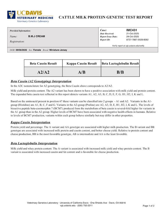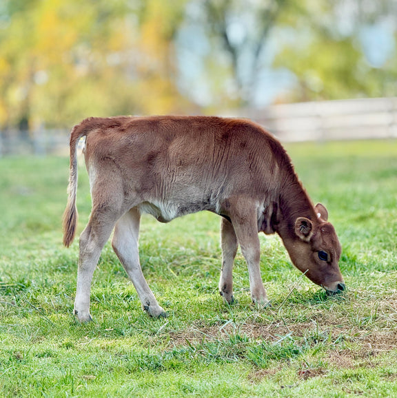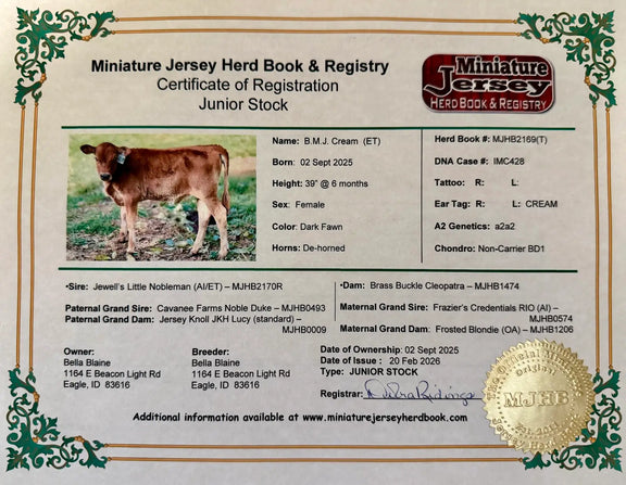 Cream is named perfectly for her beautifully light fawn, fairy-like coat, and she truly lives up to it. There’s something so soft and special about this girl. She carries herself like the mature, grown-up sister of the calves — calm, steady and already showing signs of being an incredible future mother. She is 39" at 6 months old and may go into the mid-size range which will make cream an easy milker! Cream comes from a long line of minis with excellent udders. She is A2/A2, AB/BB, de-horned, and chondro negative, sired by Jewell’s Little Nobleman and out of BB Cleopatra. Cream is destined to be an amazing homestead milk cow, passing on her gorgeous light fawn color to future calves and great milk genes.