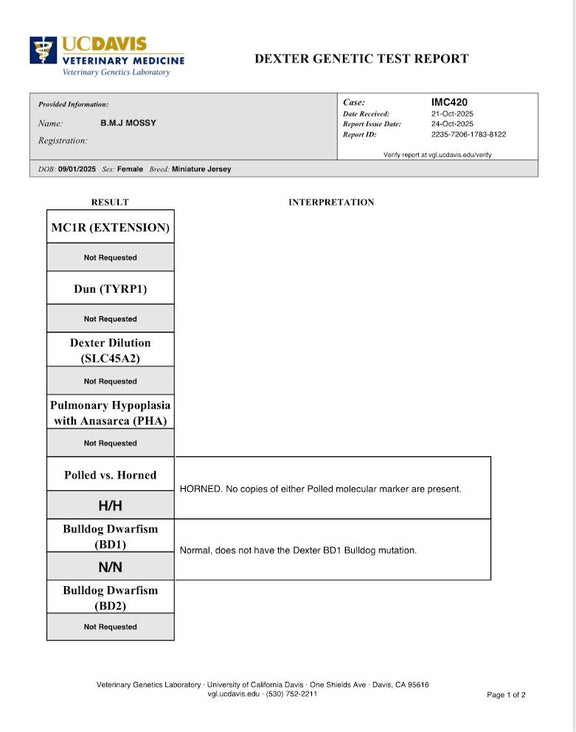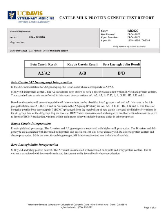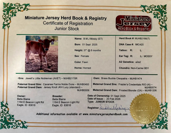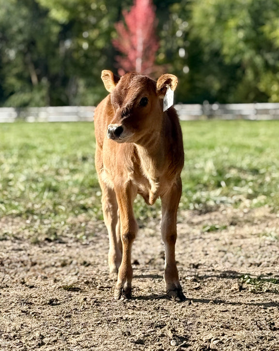 That face!!! I can’t get over this girl. Mossy is absolutely stunning and wears the most gorgeous milk chocolate coat that stops you in your tracks. She’s being cow-raised, growing steady and strong, and already shows a beautiful structure with balance and femininity. Mossy is 39" at 6 months old and may go into the mid-size range making her an excellent choice for easy milking. Mossy comes from a long line of mini jerseys with great udders, something we care about a lot. She is A2/A2, AB/BB, de-horned, & chondro negative. Sired by Jewell’s Little Nobleman and out of my all-time favorite cow BB Cleopatra. Mossy has everything going for her. She’s going to make an amazing milk cow and I can't wait to see how she shines in this breed.