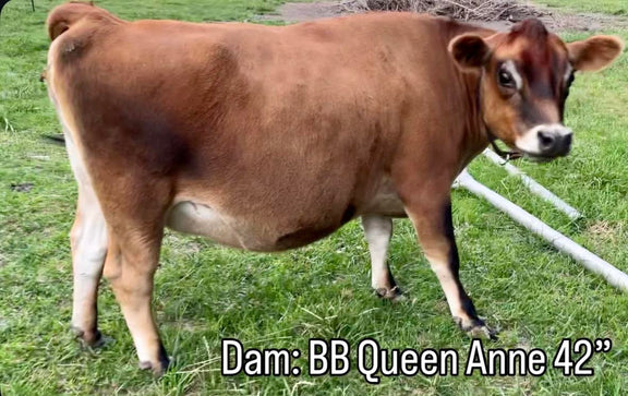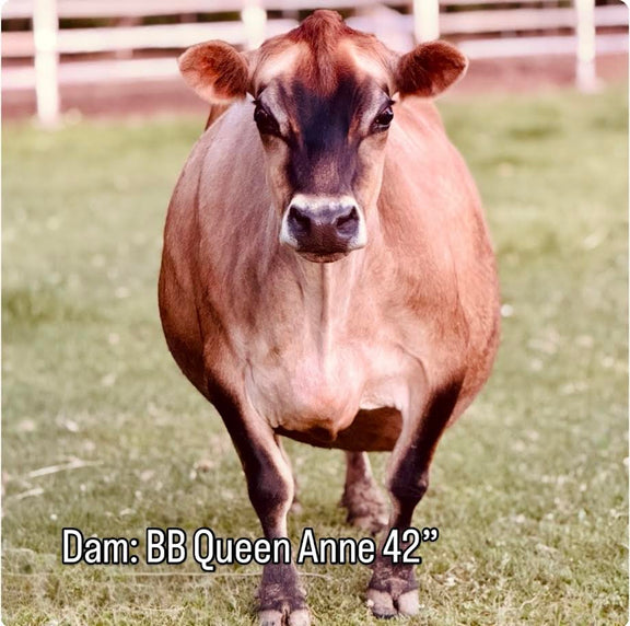 Mr. Knightley is one of those little bulls you fall in love with instantly. I was tempted to keep him myself, even before he was born, knowing exactly what his parents would produce! —he’s adorable, super tiny, and full of charm. He is a beautiful fawn color and already darkening slightly around the neck like most young bulls. He is being cow-raised, growing strong and steady. Mr. Knightley is A2/A2, AB/BB, hetero polled, and chondro negative. Sired by the famous Jewell’s Little Nobleman and out of one of our own cows, Queen Anne. This little dude is destined to make an incredible future herd sire and is turning into a friendly, respectful little bull.