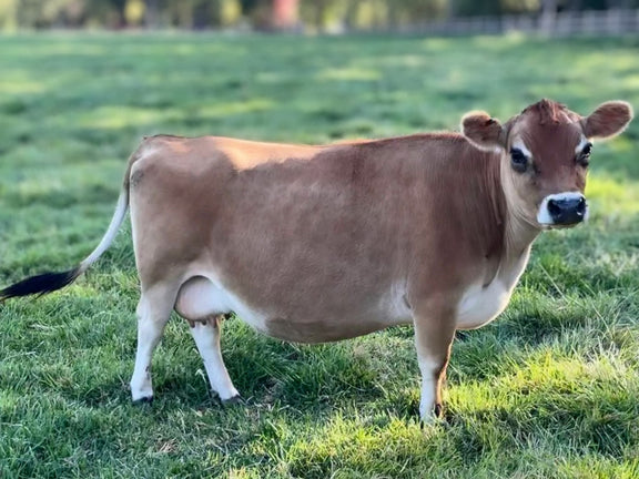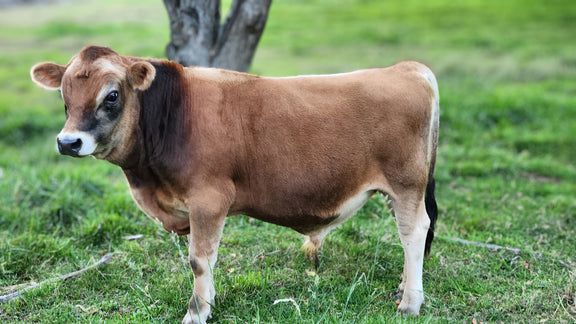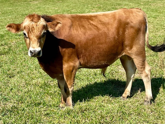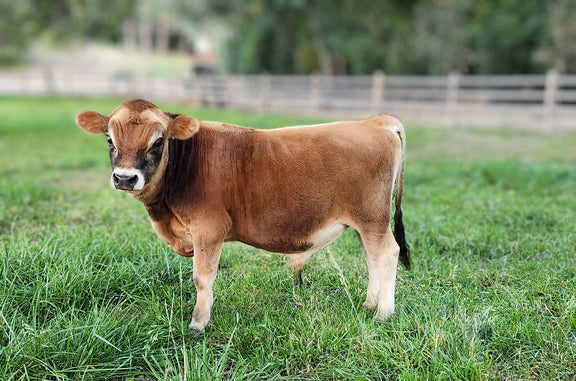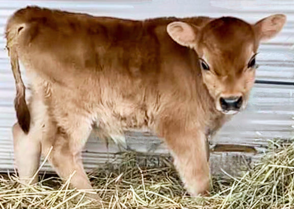 SOLD - Bambi is a small, PJA 100, Mini Jersey Bull, with a beautiful fawn coat, and a calm friendly personality. He loves attention and will eat out of your hand. Bambi now lives happily with his own herd of girls and we are excited to see the calves her will sire! SOLD
